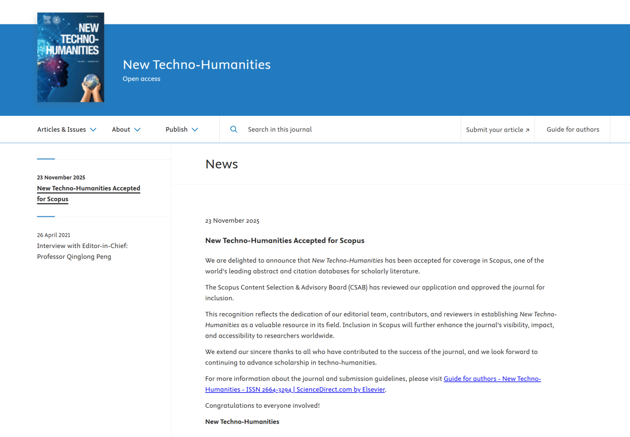 Recently, Scopus—one of the world’s most renowned academic abstract and citation databases—released its latest list of indexed journals. New Techno-Humanities, an international journal sponsored by Shanghai Jiao Tong University and published by Elsevier, has successfully passed the rigorous review of the Scopus Content Selection & Advisory Board (CSAB) and has been officially accepted for inclusion. This achievement marks a new stage in the journal’s international visibility and academic influence.