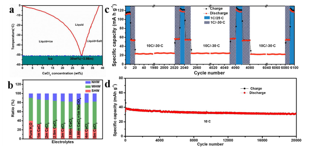 25]. The resulting frozen electrolytes are incapable of efficiently transporting ions and reducing the diffusion rate of ions. This causes poor contact between the electrolyte and electrode interface, preventing normal reactions on the electrode surface, increasing the concentration polarization, and decreasing the ionic conductivity of the SASIBs [