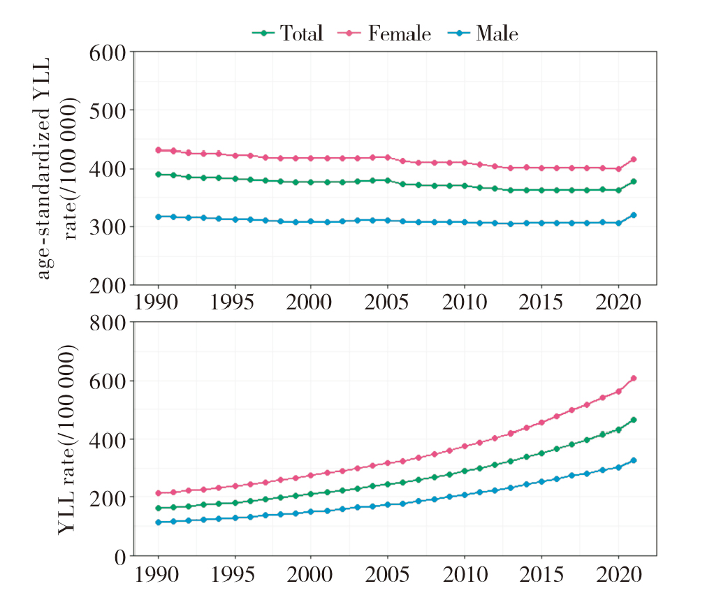 | Figure 10 Changes in YLL rates of AD and other dementia in China from 1990 to 2021 |