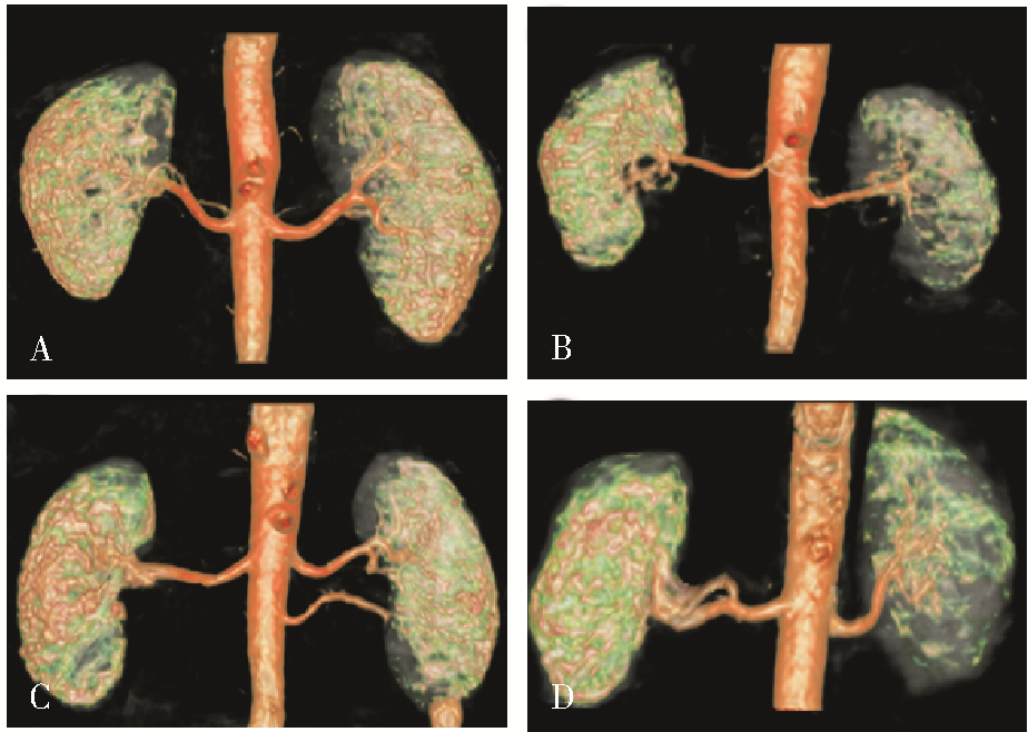 | 图1 NCE-MRA评估肾动脉 A:双侧肾动脉主干及远端未见异常;B:右侧肾动脉近段管腔重度狭窄;C:左侧副肾动脉;D:右侧肾动脉提前分支。 |