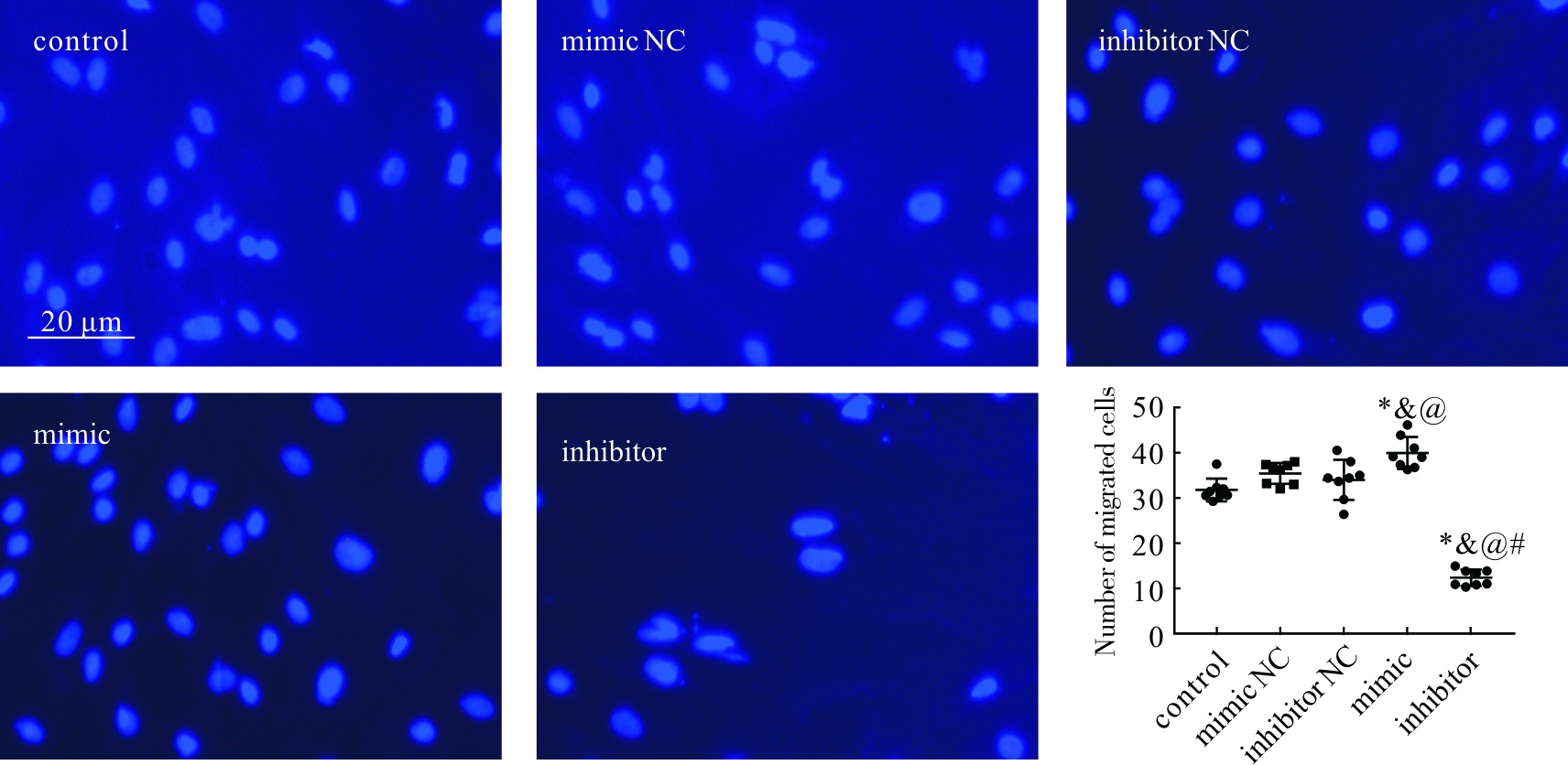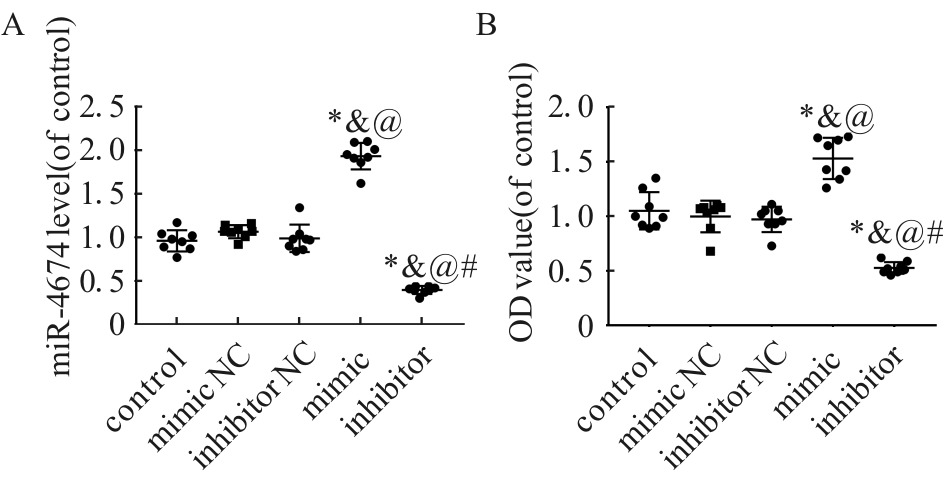 Expression of miR-4674 in each group of cells and proliferation ability of each group of cells A: Expression of miR-4674 in each group of cells; B: Proliferation abi-lity of each group of cells. *: P<0.05, compared with control; &: P<0.05, compared with mimic NC; @: P<0.05, compared with inhibitor NC; #: P<0.05, compared with mimic.