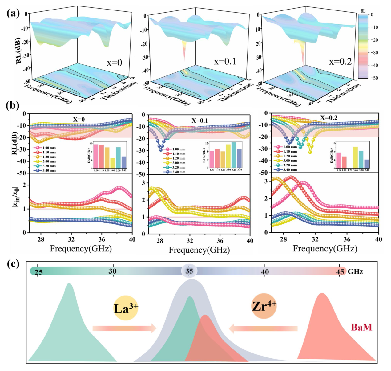 The utilization of electromagnetic waves is rapidly advancing into the millimeter-wave frequency range, posing increasingly severe challenges in terms of electromagnetic pollution prevention and radar stealth. However, existing millimeter-wave absorbers are still inadequate in addressing these issues due to their monotonous magnetic resonance pattern. In this work, rare-earth La3+ and non-magnetic Zr4+ ions are simultaneously incorporated into M-type barium ferrite (BaM) to intentionally manipulate the multi-magnetic resonance behavior. By leveraging the contrary impact of La3+ and Zr4+ ions on magnetocrystalline anisotropy field, the restrictive relationship between intensity and frequency of the multi-magnetic resonance is successfully eliminated. The magnetic resonance peak-differentiating and imitating results confirm that significant multi-magnetic resonance phenomenon emerges around 35 GHz due to the reinforced exchange coupling effect between Fe3+ and Fe2+ ions. Additionally, Mössbauer spectra analysis, first-principle calculations, and least square fitting collectively identify that additional La3+ doping leads to a profound rearrangement of Zr4+ occupation and thus makes the portion of polarization/conduction loss increase gradually. As a consequence, the La3+-Zr4+ co-doped BaM achieves an ultra-broad bandwidth of 12.5 + GHz covering from 27.5 to 40 + GHz, which holds remarkable potential for millimeter-wave absorbers around the atmospheric window of 35 GHz.