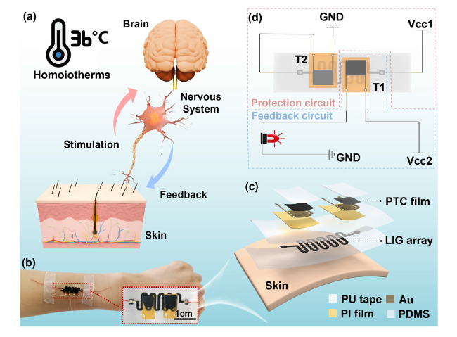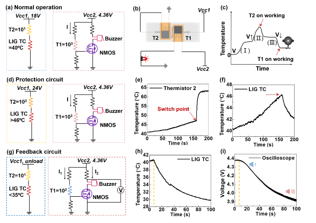 f, that the temperature of T2 changes abruptly at around 160 s monitored by thermal imaging, at this time the temperature of LIG TC drops from 46 °C. This indicates that T1 provides protection to the LIG TC avoiding being too high. At this time, T1 is still in a high resistance state, and the buzzer branch is blocked. For the feedback circuit, as shown in