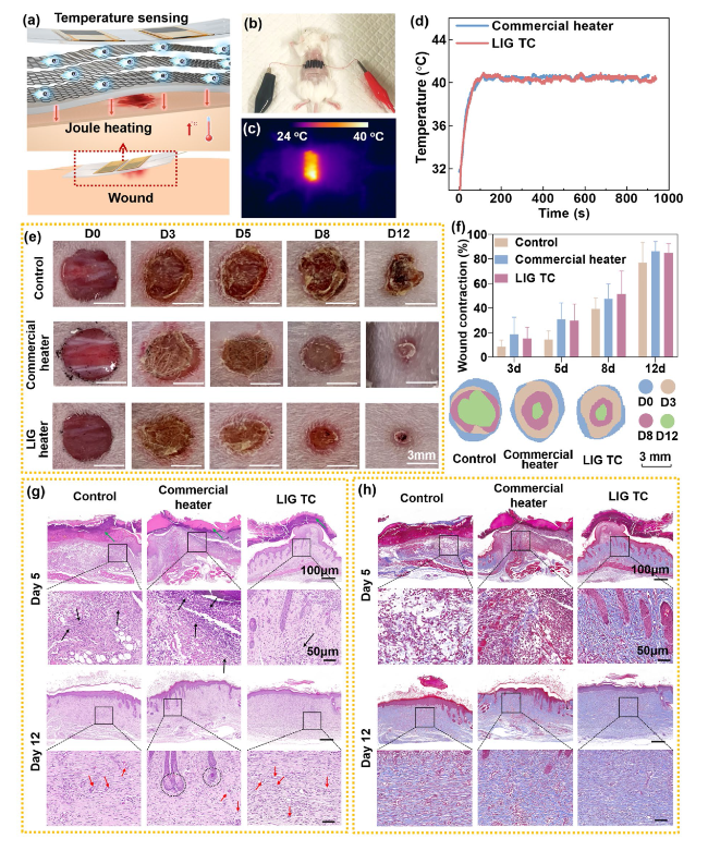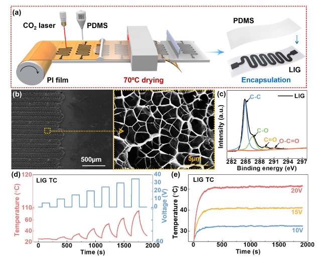Fig. 4g, a buzzer is used as an alarm. To further quantify the activation of the buzzer, we connected an oscilloscope at both ends of the buzzer and the NMOS as a voltmeter. When Vcc1 is suddenly unloaded, the temperature of LIG TC begins to drop rapidly (