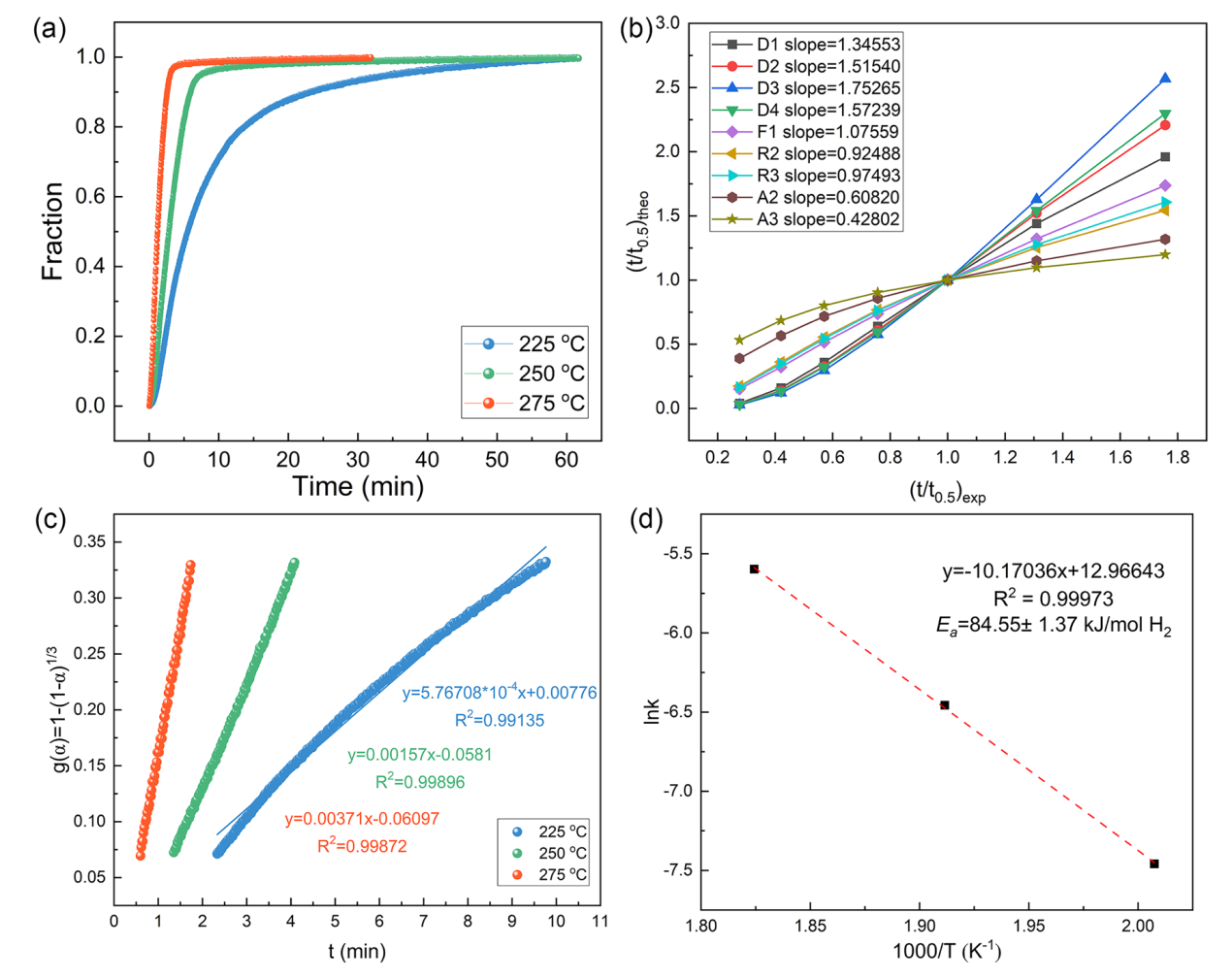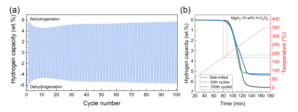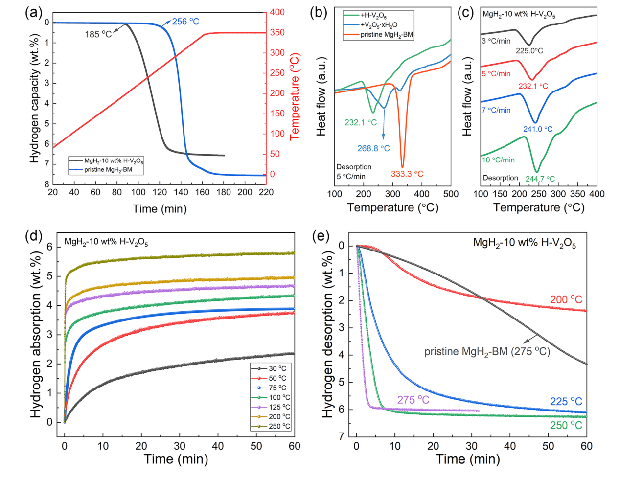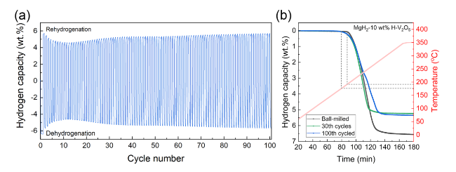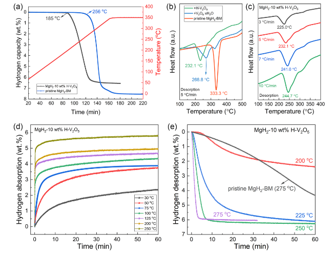 2 at approximately 256 °C with a high terminal temperature at 350 °C, delivering a hydrogen desorption capacity of about 7.51 wt%, which agrees well with its theoretical hydrogen capacity. The results showed that the hydrogen release rate of the H-V