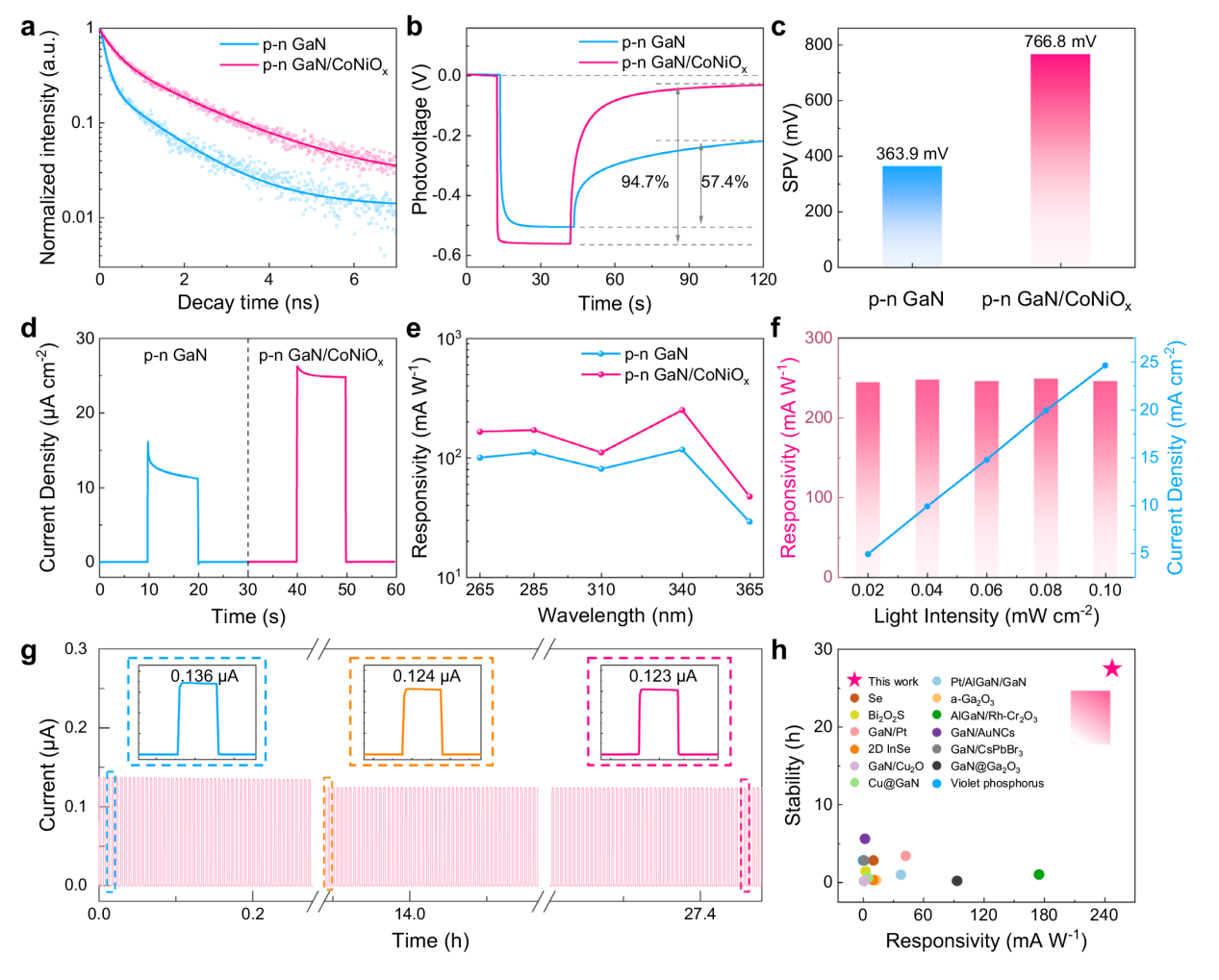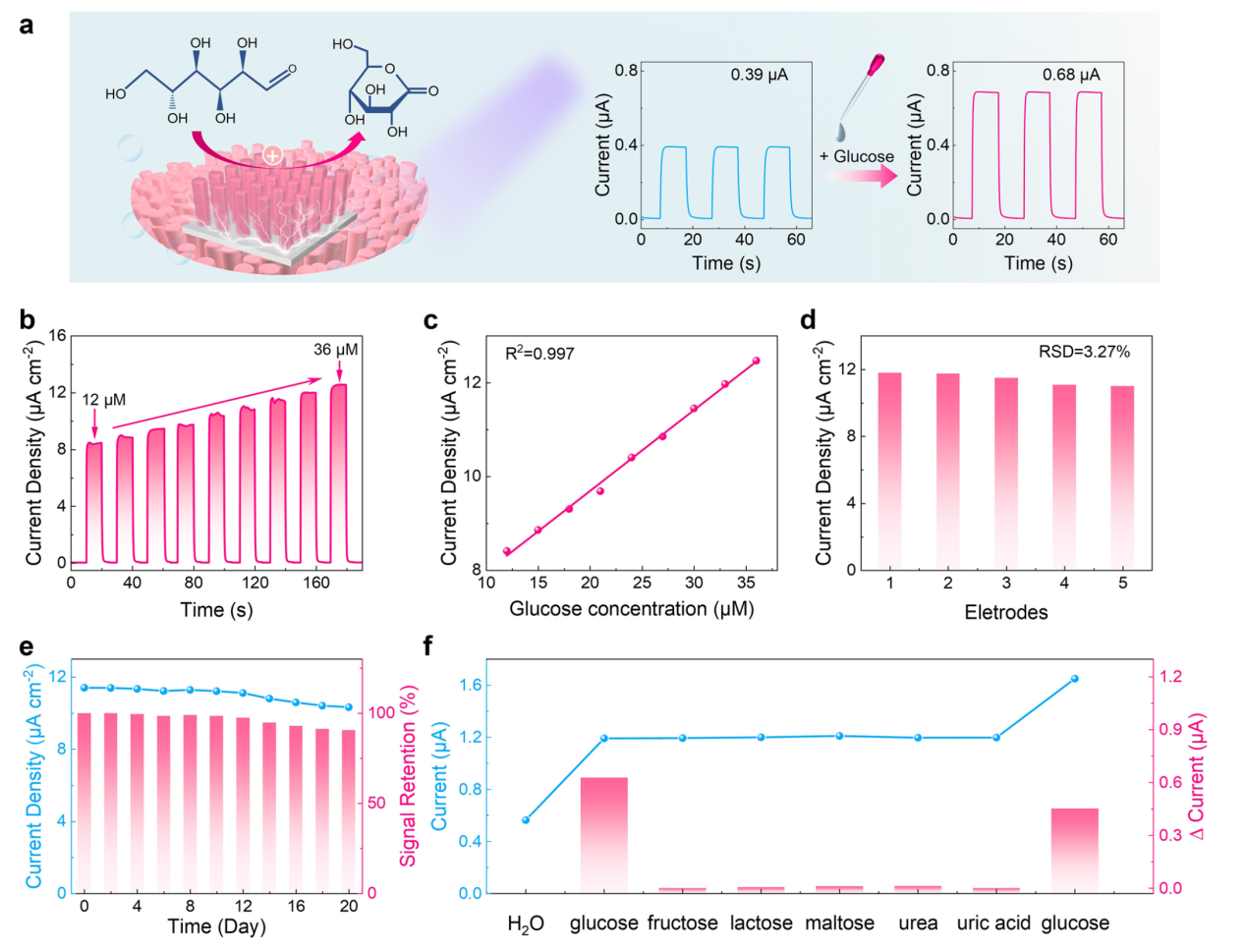 Figure 5b illustrates the relationship between the photocurrent and the concentration of glucose injected into the electrolyte. Glucose was continuously injected into the electrolyte while the solution was stirred, resulting in an enhancement of the device photoresponse with increasing glucose concentration. A linear correlation was established between the photocurrent and glucose concentration (